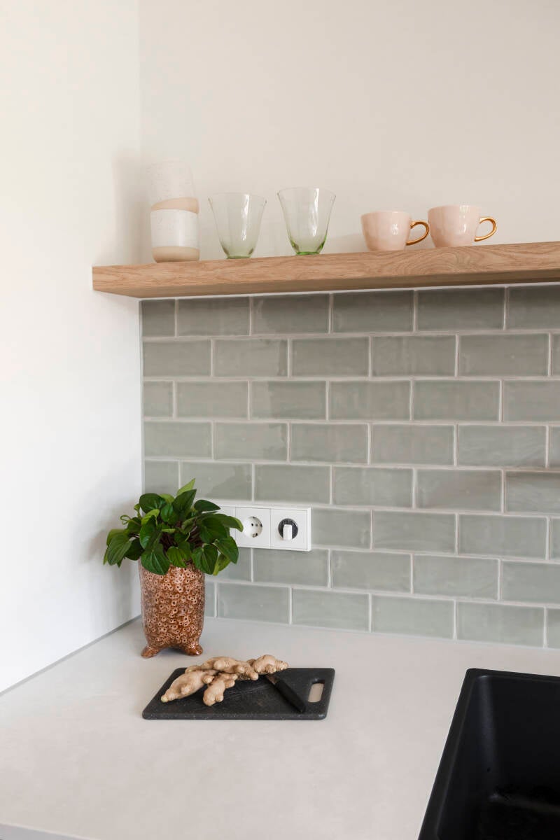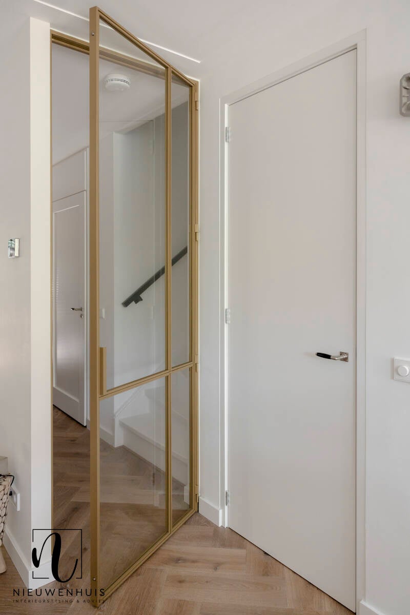 Ook tijdens het verloop van het advies kan blijken dat de persoonlijke voorkeur toch uitgaat naar een andere verhouding van de kleuren. In dit project krijgt uiteindelijk groen meer een plek in het geheel en wordt er gekozen voor meer accessoires én een deur van staal in goud.