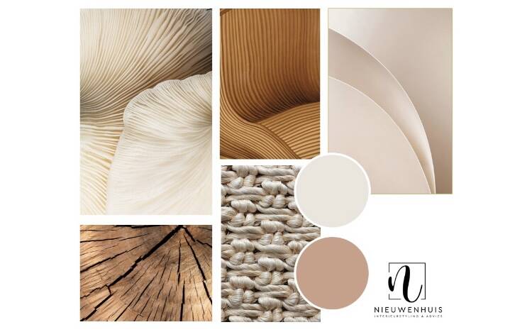Het sfeerbord wordt het uitgangspunt voor het kleur- en materiaaladvies. Een rustige basis met zachte kleuren en een stoere twist!